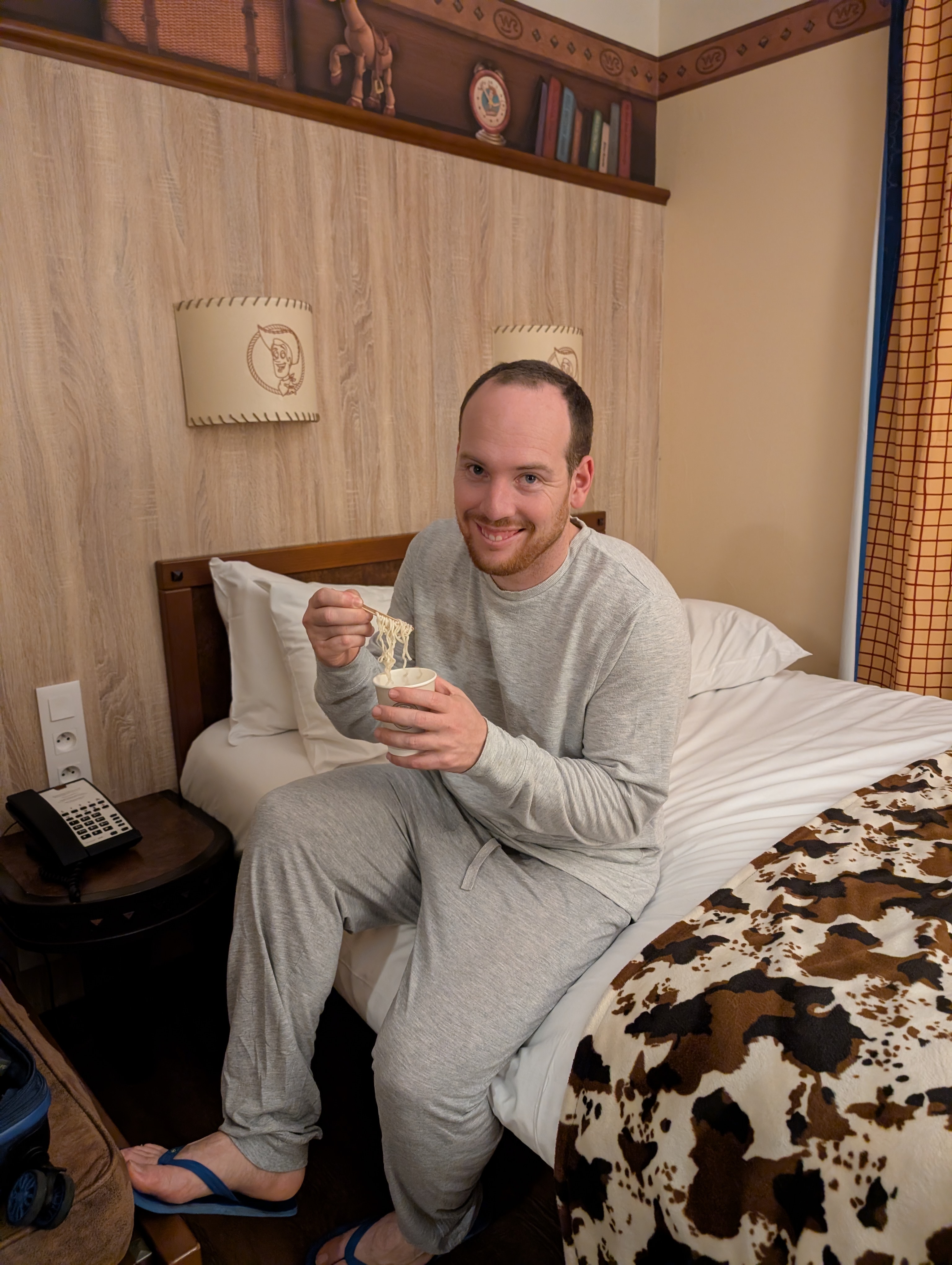 Sabem que un problema de Disneyland és que el menjar és molt car (i que no és precisament gaire bo). Per tant, vam decidir omplir les maletes de menjar per poder anar menjant coses prou bones durant aquells 4 dies: una bossa sencera de mandarines a la motxilla de l’Esteve, 6 plàtans, pa amb 3 paquets d’embotits, algunes galetes i tortites, pa de pipes, 4 entrepants de botifarra i uns fideus que no sabíem si era bona idea emportar-nos per diverses coses: hi haurà bullidor d’aigua a l’habitació? un recipient on menjar-los? cullera o forquilla?… però vam decidir que seria la millor idea.